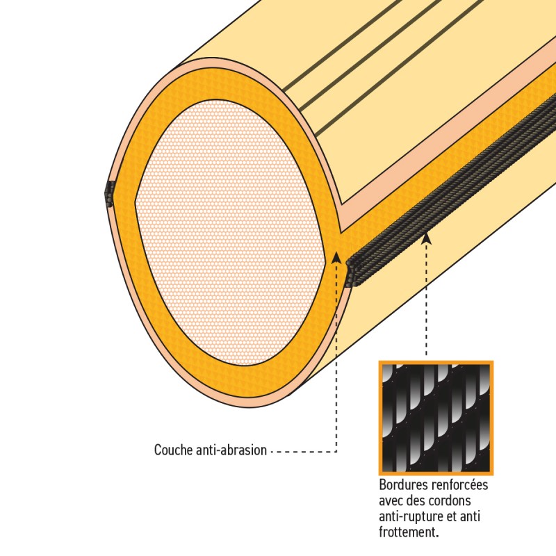 Bordures renforcées avec des cordons anti-rupture et anti-frottement.
